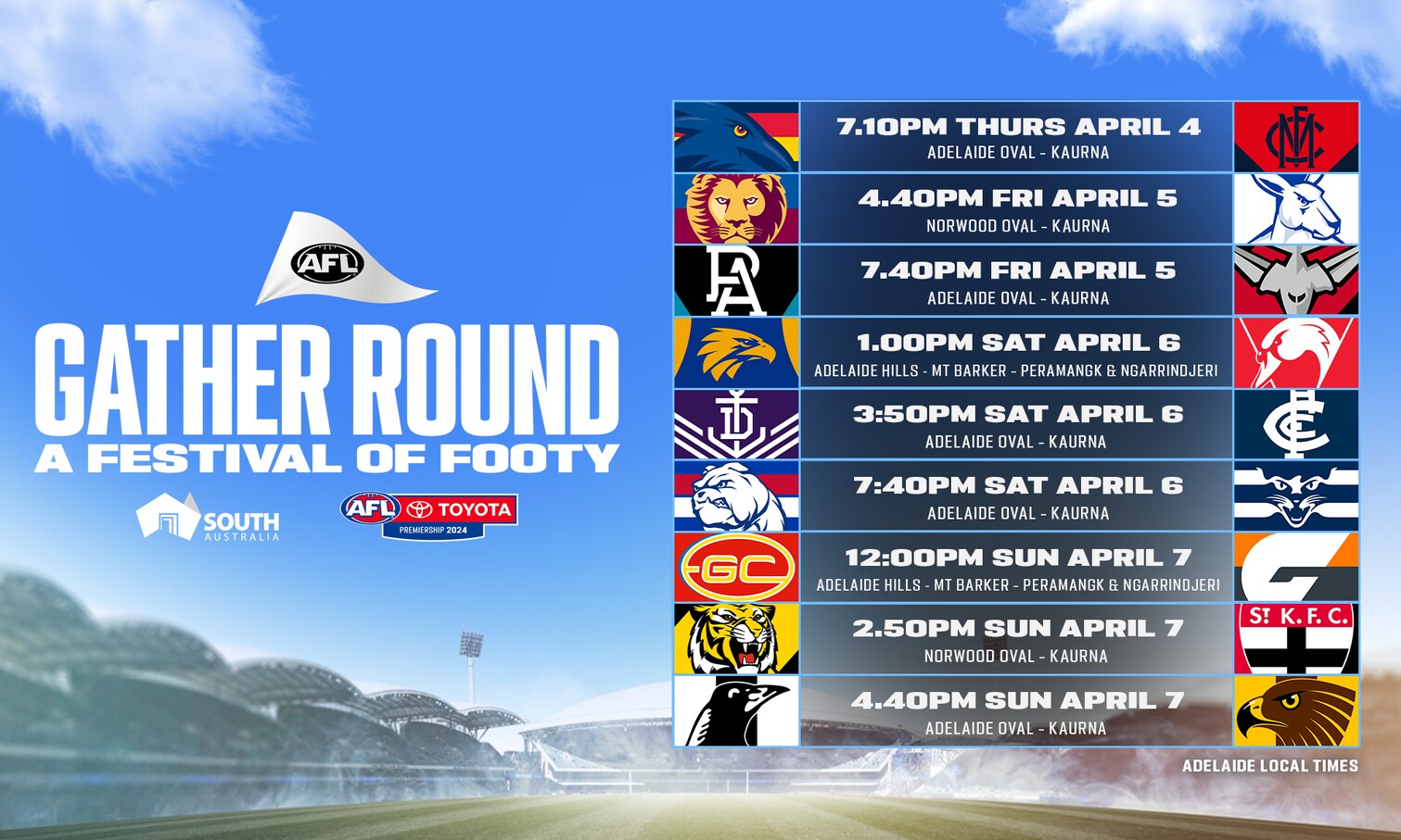 Source : glamadelaide.com.auGather Round fixture announcement 2024 schedule games venues times